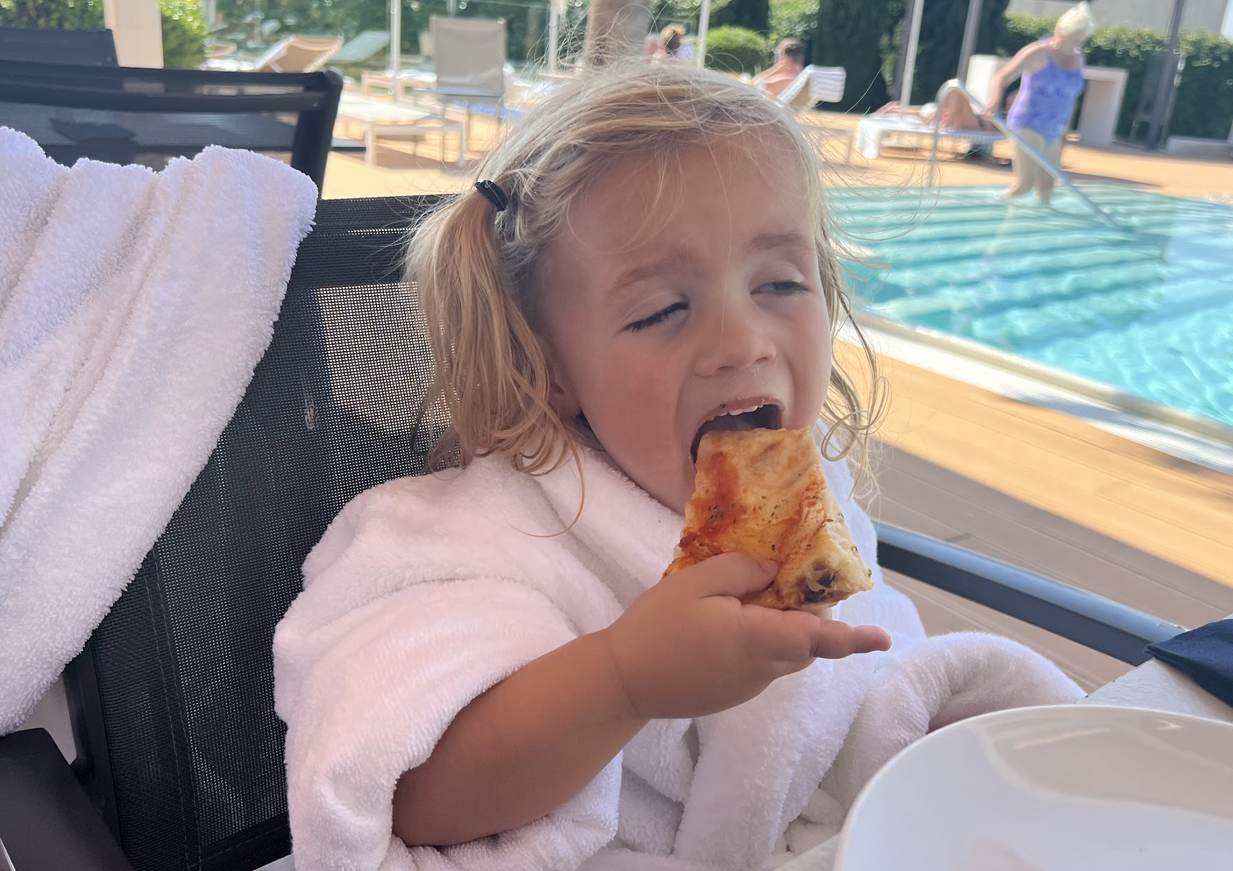 Maeve loves to swim. She's a fish. She screams and splashes. Her sister on the other hand ate pizza in a bath robe.